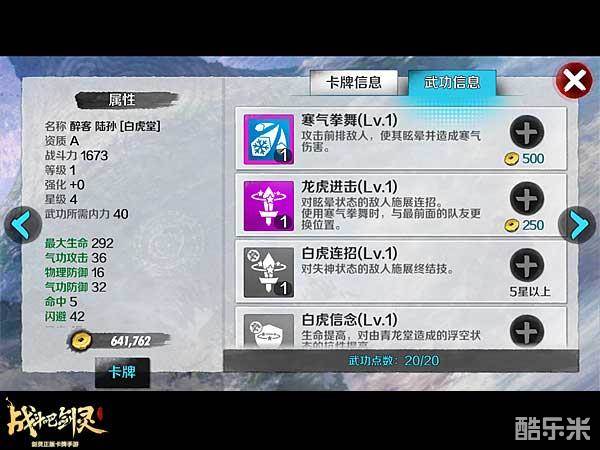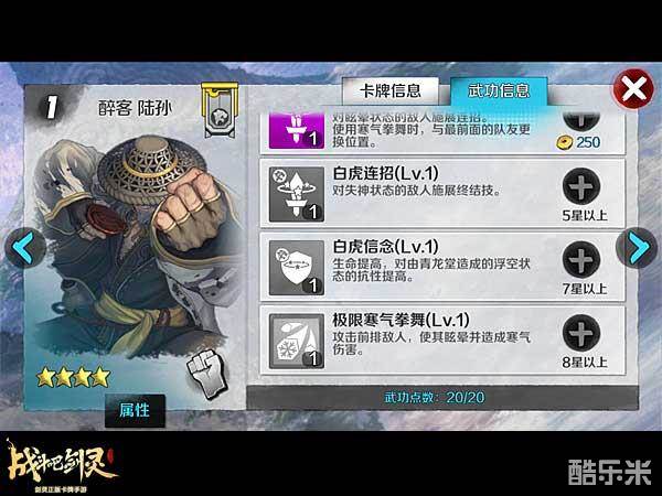 对于中后期的对抗来说,内力是最为关键的因素。4内的醉客陆孙攻击范围广,输出足,有眩晕控制并能够造成寒气伤害。作为拳师有换位技能。出手快、能打能抗能控,是中后期白虎理想的主力阵容卡牌。