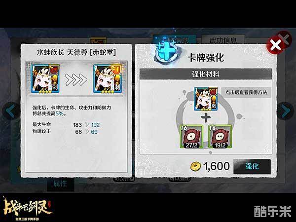 刺客的水蛙族长 天德尊,强化需要用到的材料是红色的外功身法,由于用到这个材料的卡牌较多,水蛙族长 天德尊作为后期的卡牌,升星途径较多,可以选择强化顶级。