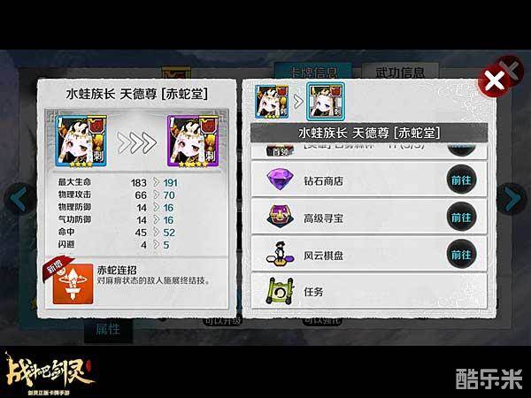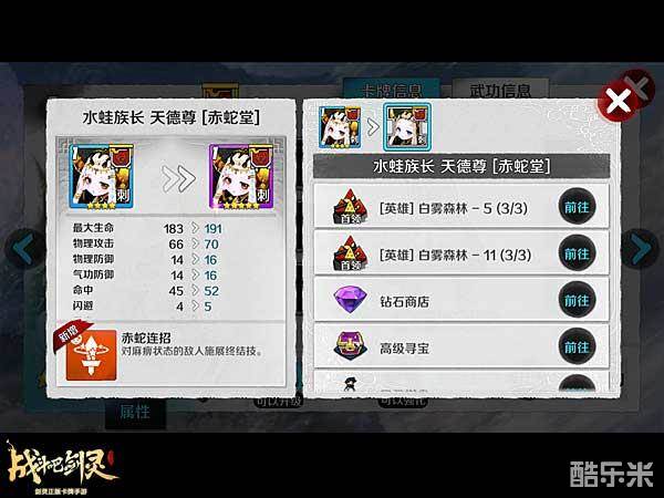 水蛙族长 天德尊在推图到白雾森林后可以直接扫荡碎片。升星到5星还是非常快的。5星后,作为麻痹流的发动机,可以带领一支后期赤蛇阵容,相信3内的带毒刺客,会让对手非常害怕。