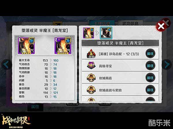 堕落戒灵 半魔王的升星途径还是比较多的,有1个关卡掉落,是后期地图浮岛总舵的关卡;高级寻宝是前期获得的主要途径。后期可以通过攻城商店任务获得其碎片。