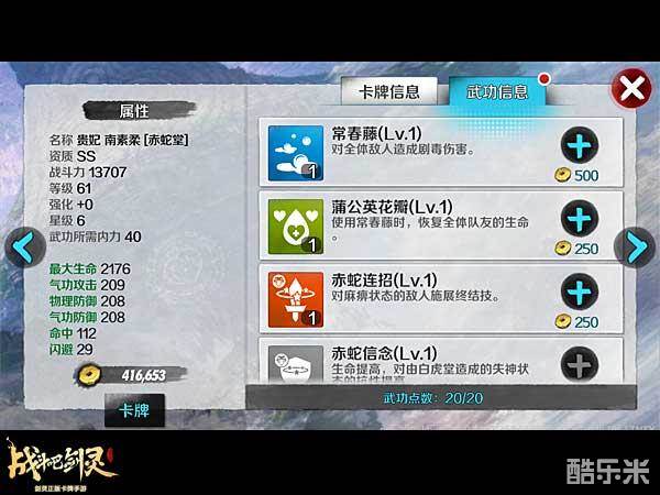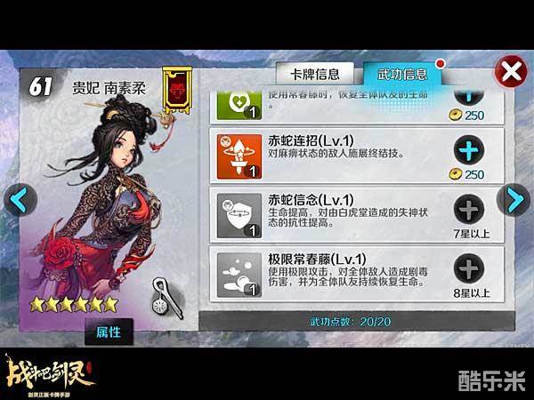 贵妃 南素柔的武功应该是目前已出卡牌中变化最为多样的。作为一个召唤师,第一技能是以输出为主,全体的剧毒伤害不亚于一个强大的气功师。8星后改动更是大,直接变为单体攻击加眩晕控制,并且为同排队友持续恢复生命。