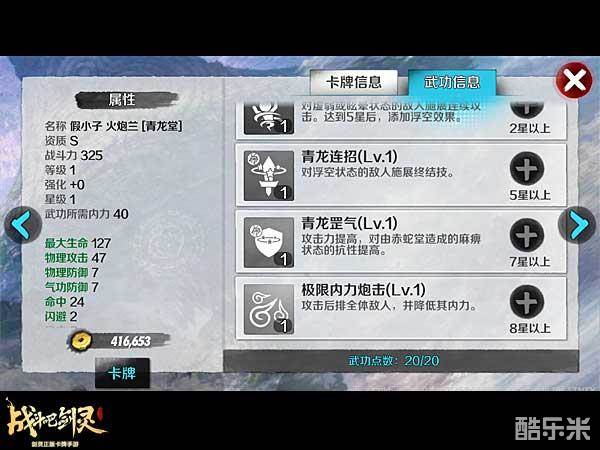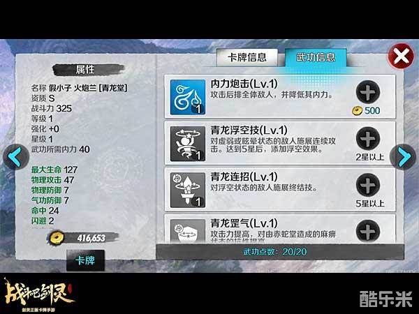 后期的枪手数量不是很多,S资质的假小子 火炮兰,是一个值得培养到后期的S资质卡牌。4内,武功是后排全体攻击并减内。二段连招可以搭配所有阵容,青龙堂后期的给力卡牌。