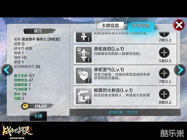 武功是后排的全体攻击,并且造成火焰伤害。赏金猎手 陈苏儿的输出给力,控制稍显不足。二段连招可接状态较多,能够搭配的阵容比较广泛。最为出色的是,赏金猎手 陈苏儿是3内,这样的枪手,频繁的点射,将是后排的致命打击。
