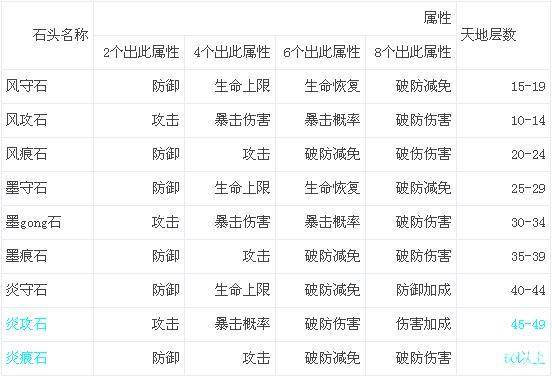三、关于9种石头各星阶属性的说明:
