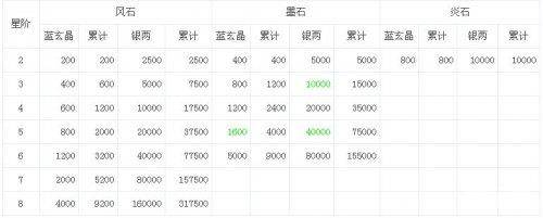 4、三个类别石头升阶需要蓝玄晶如下表:
