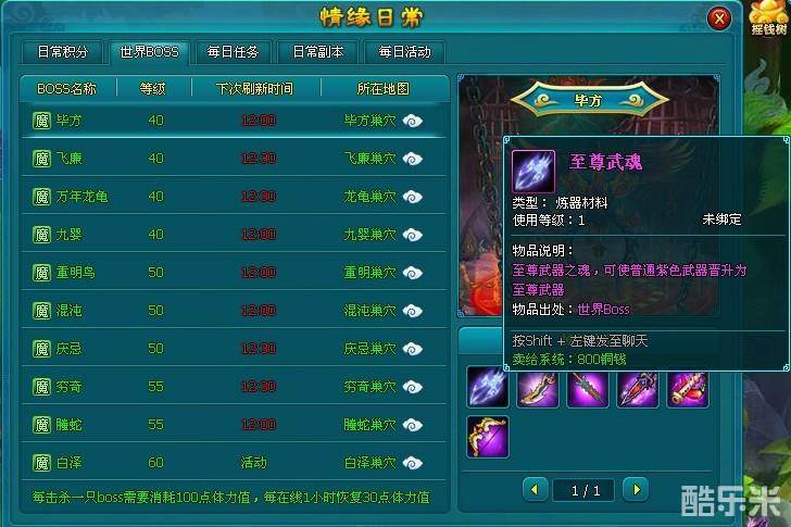 击败世界BOSS即有较大几率获得至尊武魂的机会哦,另外如果人品给力的话,还有机会直接掉出相应等级的至尊装备,省时省力哦。