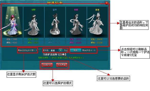 不过路上可要小心觊觎仙女美色的贼人们,他们可是会对你发起拦截的!如果战败将导致护送失败,只能获得一半的经验奖励。而拦截成功的玩家将获得另一半的经验。