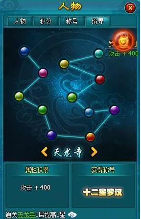 通关轮回塔、天龙寺、古天庭3个副本,分别获得对应境界等级,每通关一层提高一层境界。
