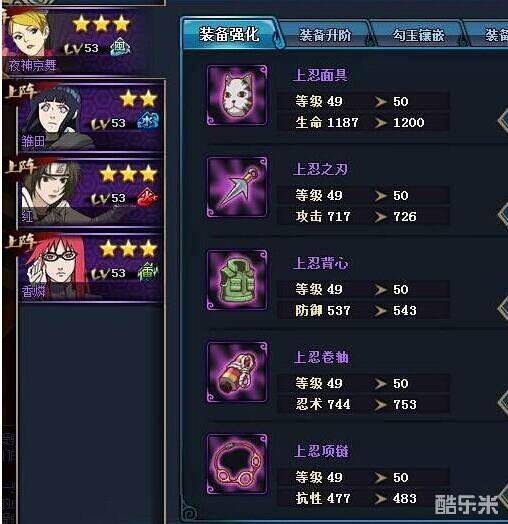 装备强化所增加的是装备对应忍者的属性。生命、攻击、防御、忍术、抗性