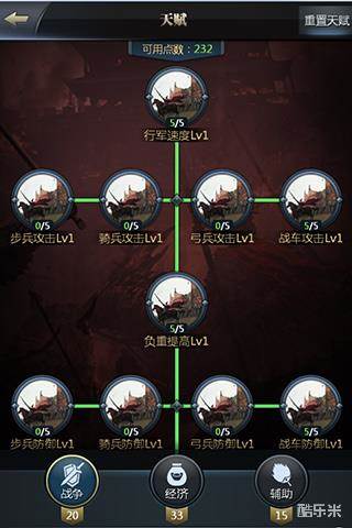 每种天赋属性之下会有相应的技能需要主公研究升级,例如经济属性之下对应的是寻访时长、农田产粮、市场产钱的等具体技能,研究这些技能便得以切实缩短寻访时长、增加农田产量、增加市场交易量等.只有不断升级这些技能,才能使自己的天赋从低到高,不断提升.
