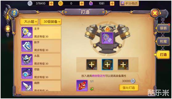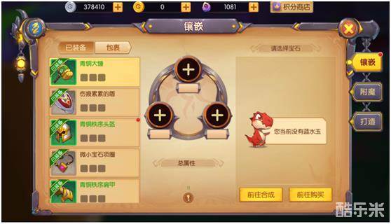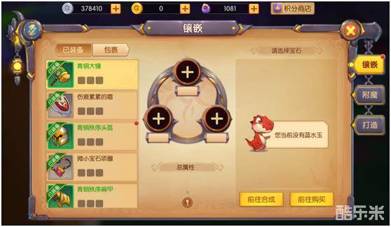 3)装备镶嵌:对装备进行镶嵌,装备会获得镶嵌宝石的属性。