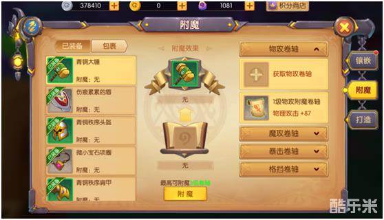 2)装备附魔:对装备进行附魔,会额外增加装备属性,消耗特定的附魔卷轴即可附魔,附魔卷轴在副本掉落;