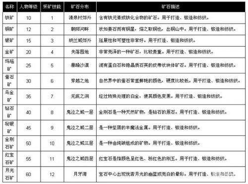 玩家可以通过采矿获取不同质量的矿石,提供给打造、工艺技巧、纺织工艺使用。采矿技能的所采集的矿石质量成功率与当前技能等级、技能熟练度有关。玩家技能等级决定玩家是否可以开采相关等级的矿石。玩家技能熟练度越高,产生当前等级质量矿石越高。玩家人物等级及相关的技能熟练度决定玩家是否可以学习当家等级技能。熟练度的增长与玩家采集次数、技能成功有关。