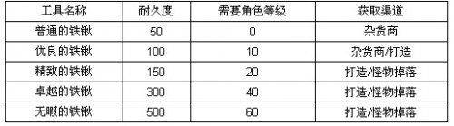 采集工具:玩家必须携带相应的采矿工具才可以在相应的区域进行采集,不同采集工具所对应的耐久度不同。