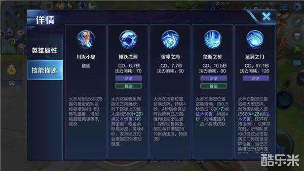 一技能——鲤跃之潮:一技能不仅是大乔的控制技能,更能提高河流上队友的移动速度,提高整个团队的机动性,无论是进攻还是撤退都非常实用。
