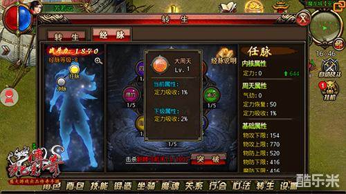 转生后,完成任务经脉就会开启,这时打开经脉系统界面,就可以清晰的看到初始经脉图了。中心部位为经脉内核,每当经脉内核满级后,就可以开始激活下一个经脉了,每多开一个经脉战斗力和基础属性都能得到大幅提升。