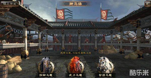 玩家在君主府等级20级后方可开通“御马场”功能,招募战马,并且在武将达到50级后,才可装备战马。相对于其他装备而言,战马的获得方式可以说很苛刻了,但这和他们发挥的作用是相符的。御马场相马有三个选项,从左到右分别为“防御马厩”、“武力马厩”和“智谋马厩”,他们分别出产对应属性的战马,主公可以方便地根据所需获取战马。