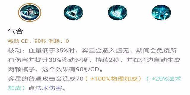 整体分析:弈星的保命技能,低于35%血量时免疫所有伤害并提高移速2秒,还会在旁边生成两颗棋子,需要知道的是两颗棋子会相互靠近并爆炸,造成伤害与减速,加速自己与减速敌人可以让弈星轻松脱离集火地带。普攻造成物理与法术加成的法术伤害。