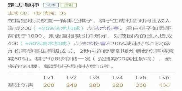 整体分析:释放一颗黑子,对敌人造成法术伤害。此技能最多可以储存四颗,每颗棋子最多持续15秒。