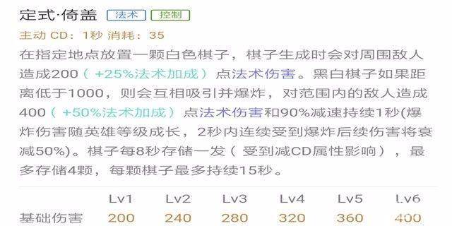 整体分析:释放一颗白子,对敌人造成法术伤害。此技能最多可以储存四颗,每颗棋子最多持续15秒。当黑白子距离低于1000时,就会相互吸引,双子触碰时会触发爆炸,对范围内敌人造成法术伤害并减速。