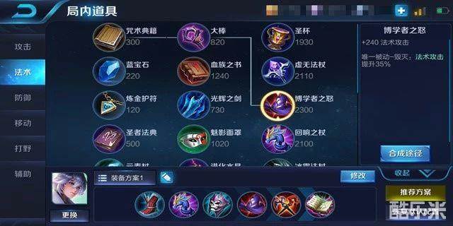 最后一件贤者之书,简单的400法强加上1400最大生命,却是弈星后期最需要的两种属性。可以保证弈星的输出与生存环境。但如果敌方的坦克比较多,就可以换成虚无法杖,此装备的被动是将铭文和痛苦面具提供的法术穿透增幅45%,极大地提高了弈星的打肉能力。
