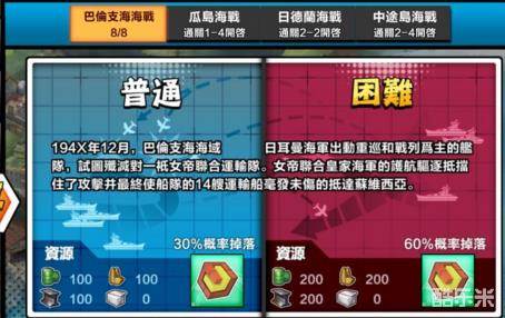 Ø战役难度:战役分为普通通和困难2个难度。普通难度,可以上阵任意舰船。核心掉落几率为30%,困难难度,对舰队编成有条件的限制。上阵数量必须满足战役的需求,核心的掉落几率为60%。