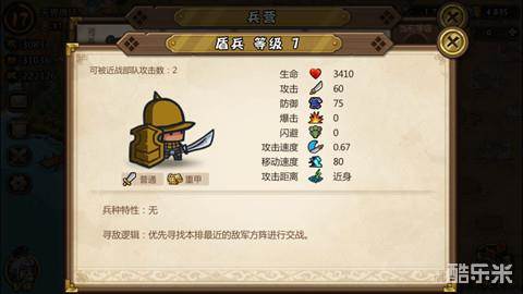 盾兵有两个接战单位,攻击类型为普通,在面对锁甲类的敌人时,能够造成150%的伤害,所以非常适合用来阻挡各种骑兵的突进;