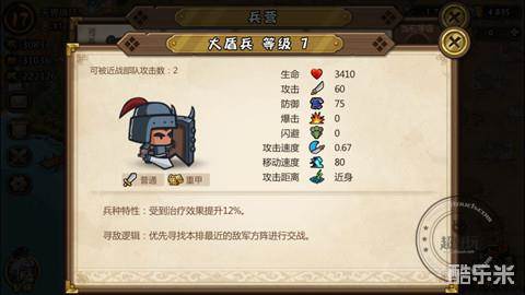 大盾兵的兵种特性为,收到治疗的效果提升12%;