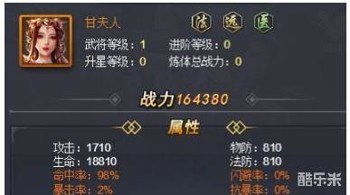 甘夫人的攻击有1710点是十分优秀的基础属性了,但是双防和血量比较低。不是很优秀。