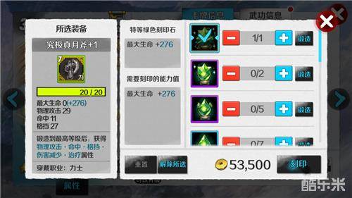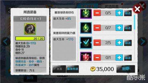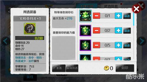 点击装备->刻印,选择需要打上去的刻印石,支付一定金币就可以对装备进行刻印。点重置可以清除装备的所有属性(无金币消耗)