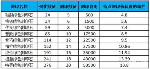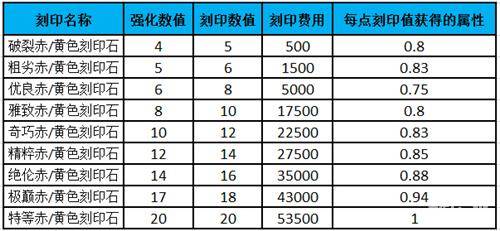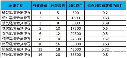 攻击刻印:从图中可以看到【破裂】和【雅致】、【粗】和【奇巧】每点刻印值的攻击是相同的,但是所需金币却少了很多。所以前期推荐使用破裂和粗劣品质的刻印石,把剩余的雅致、奇巧合成更高级的刻印石来使用,这能让你在保证不浪费刻印石的前提下在前中期获得更多的属性加成。