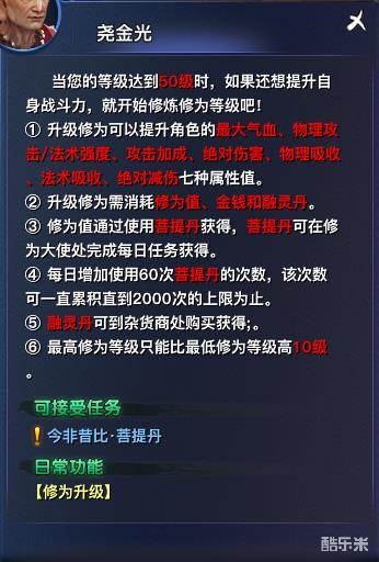 1.当玩家当前角色达到50级后,便可接取“修为·气沉丹田”引导任务开启修为系统,根据任务提示可在五方城NPC(608,337)处找到尧金光,打开修为升级界面进行修为升级。