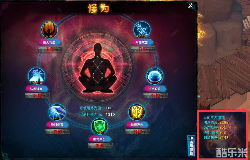 修为系统能够大幅度的增加角色的属性值,属性值直接加成到角色面板上。修为系统一共有7个属性:分别为最大气血、附加攻击、法术吸收、物理吸收、绝对减伤、绝对伤害和法术强度,每一级等级提升均会增加相应属性值以及玩家的战斗力评分。