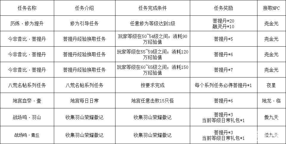 1.玩家可通过完成修为大使处的“今非昔比·菩提丹”任务,来获取菩提丹,使用菩提丹获得修为值,完成任务需要消经验值;