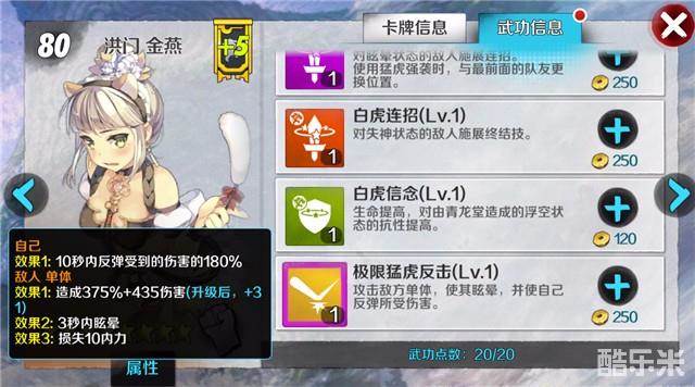金燕的极限技能“极限猛虎反击”在“猛虎反击”的基础上武功的基础伤害提升到了极致,并且每一个武功等级提升的伤害量也大幅度增加。