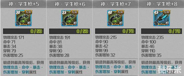 作为兰兰的神级武器,学生枪有着高于其他武器的初始属性,能在一开始就提供相当于一把+8(45级)普通武器的属性。