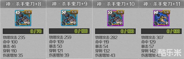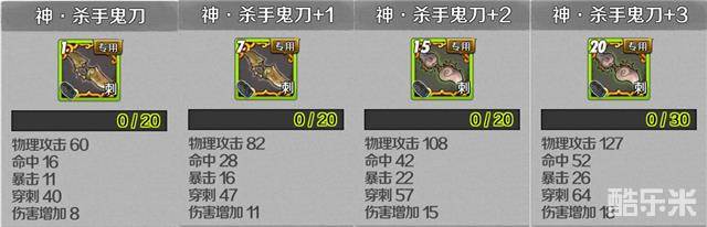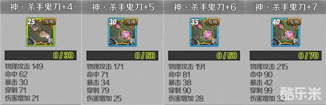 离的杀手鬼刀有着相当高的成长值,物理攻击、命中、暴击、穿刺、伤害增加属性都能让离的攻击能力更上一层楼。