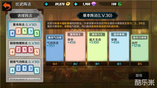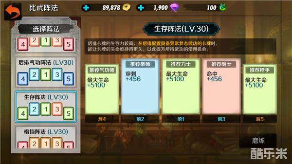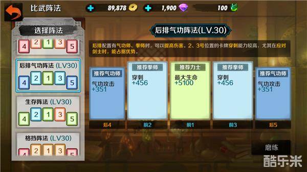 这个阵法主要提高整体生存能力,尤其是后排有异常状态武功的卡牌时,可以使其生命维持的更久,提高武功的使用机会。