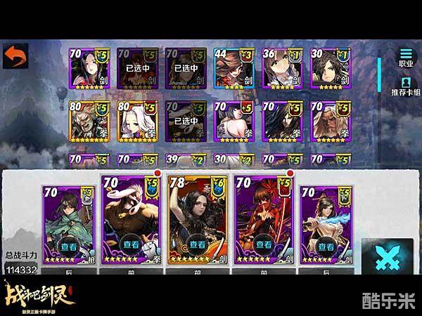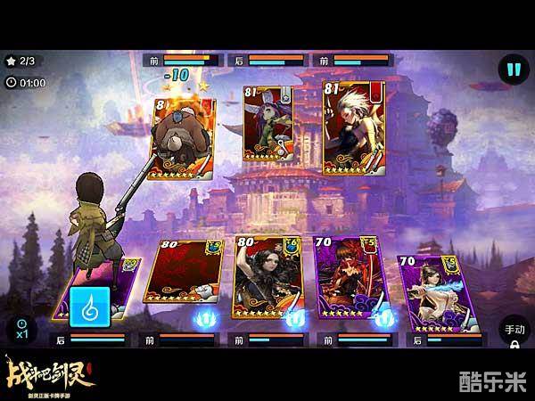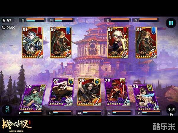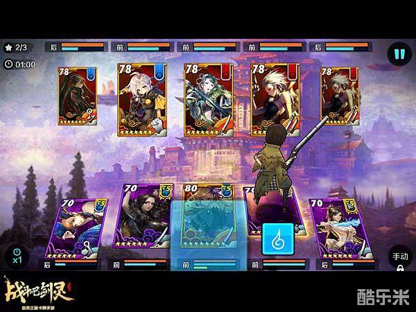 这一关对手的防御体系强大,攻击力度相对不那么厉害。所以整体选择不要召唤师,而是加一个弱化对手的剑士。1号位5号位由于会被换位,都选择剑士。2号位选择有前排保护技能的卡牌。枪手李逍遥的选择是用其换位技能来处理第三波的召唤师。