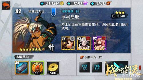 关卡:浮岛总舵,推荐等级82副本卡牌星级7颗星,单次消耗体力为12点。