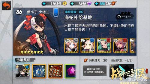 海蛇补给基地,推荐等级86级,副本卡牌星级7颗星,单次消耗体力为30点,通关奖励:假小子火炮兰卡牌碎片(副本级别关卡卡牌碎片一次掉落为3个),印章(卡牌升星所需材料)五角红水晶、260卡牌升级经验/1800金币。