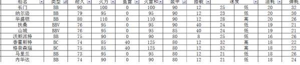 由表格可见,战列级的舰船,装甲在80~90,火力在85~110,战巡拥有雷装。战列和航战中除华盛顿均为低速舰。战巡拥有雷装。