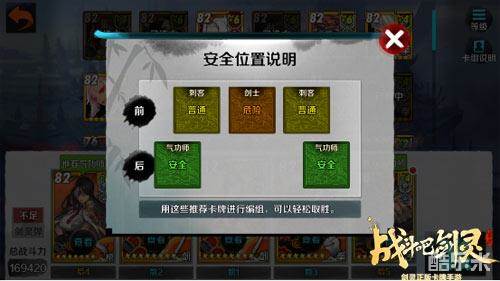 前排为1剑士(位置等级危险),2号/3号为刺客(位置等级普通),4号/5号为气功师(位置等级安全)。在卡组说明中我们可以看到后排的位置等级为安全,所以可以给后排安排输出定位卡牌或者召唤师辅助卡牌,不一定就要跟卡组说明中推荐的一样。