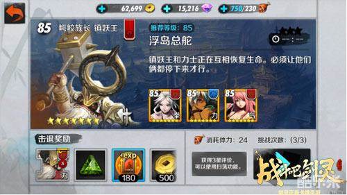 关卡:浮岛总舵英雄级别关卡3,推荐等级85副本卡牌星级7颗星,单次消耗体力为24点。通关奖励:镇妖王卡牌碎片、3角翡翠宝石、180卡牌升级经验/500金币。