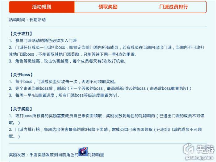 门派大战BOSS作为网页活动内置游戏中,每个成员每天只能攻击3次BOSS,每个BOSS需要至少攻击一次,才能获得奖励~BOSS等级分为6个等级 ,击打越高等级的BOSS获取的奖励会越多。合理分配每天的3次击打次数,获取最高效益就是小伙伴要考虑的问题了