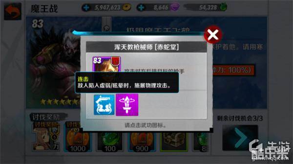 技能1激拳:后排眩晕攻击,伤害11500-12500(不暴击)