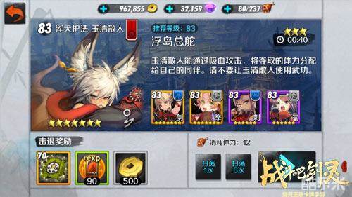 关卡:浮岛总舵8,推荐等级83副本卡牌星级7颗星,单次消耗体力为12点。本关卡看似玉清散人坐镇难度非常的大,但是讲究技巧,使用一定的小窍门3星评价还是较为容易的,通关奖励:高级心法(卡牌心法升级所需材料)90卡牌升级经验/500金币。