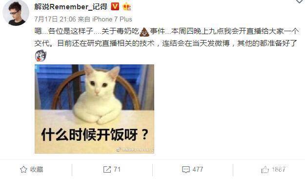 而就在前几天,记得发微博说毒奶吃屎会给在本周四晚上直播给大家一个交代,激起了大家的兴趣。但记得并未表示去哪直播以及怎样直播。一时间网友也是心生疑问,不知道记得葫芦里卖的什么药。
