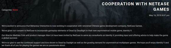 我们同意网易在他们的非对称对战手游《第五人格》中使用《黎明杀机》的玩法要素。