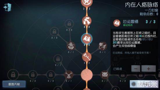 (4) 厄运震慑天赋,厄运震慑是概率一刀斩,点满之后有20%概率触发求生者一刀倒地效果,是个看脸的天赋。